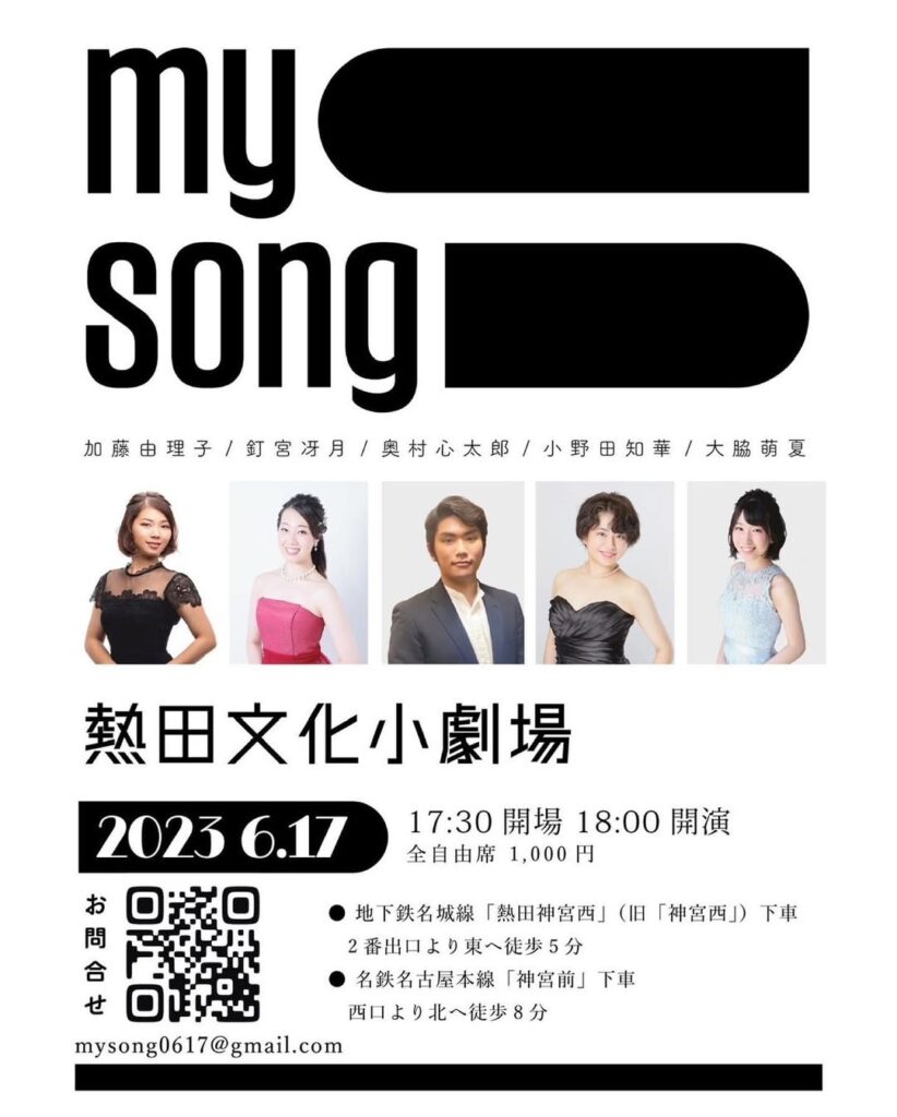 【my song】 2023年6月17日18時開演 Concert X Mastodon Bluesky Misskey Facebook はてブ LINE LinkedIn コピー 2023.05.17 2023年6月17日に my song と題した演奏会に伴奏者として出演します。 日時:2023年6月17日(土) 17:30開場 18:00開演場所:熱田文化小劇場料金:1,000円/全席自由